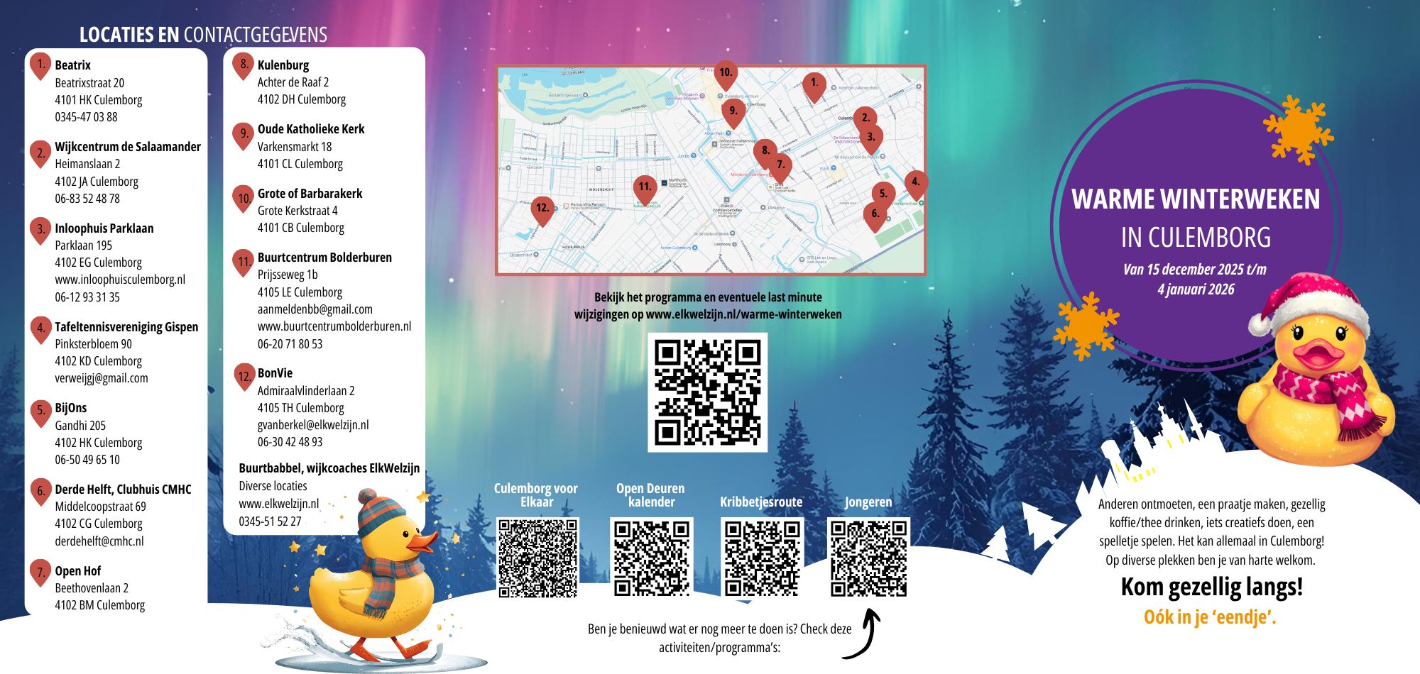 Anderen ontmoeten, een praatje maken, gezellig koffie drinken, iets creatiefs doen, wandeling maken, naar een mooi optreden, samen eten? Het kan allemaal in Culemborg! Op diverse plekken ben je tijdens de ‘warme winterweken’ van harte welkom. Kom gezellig langs!