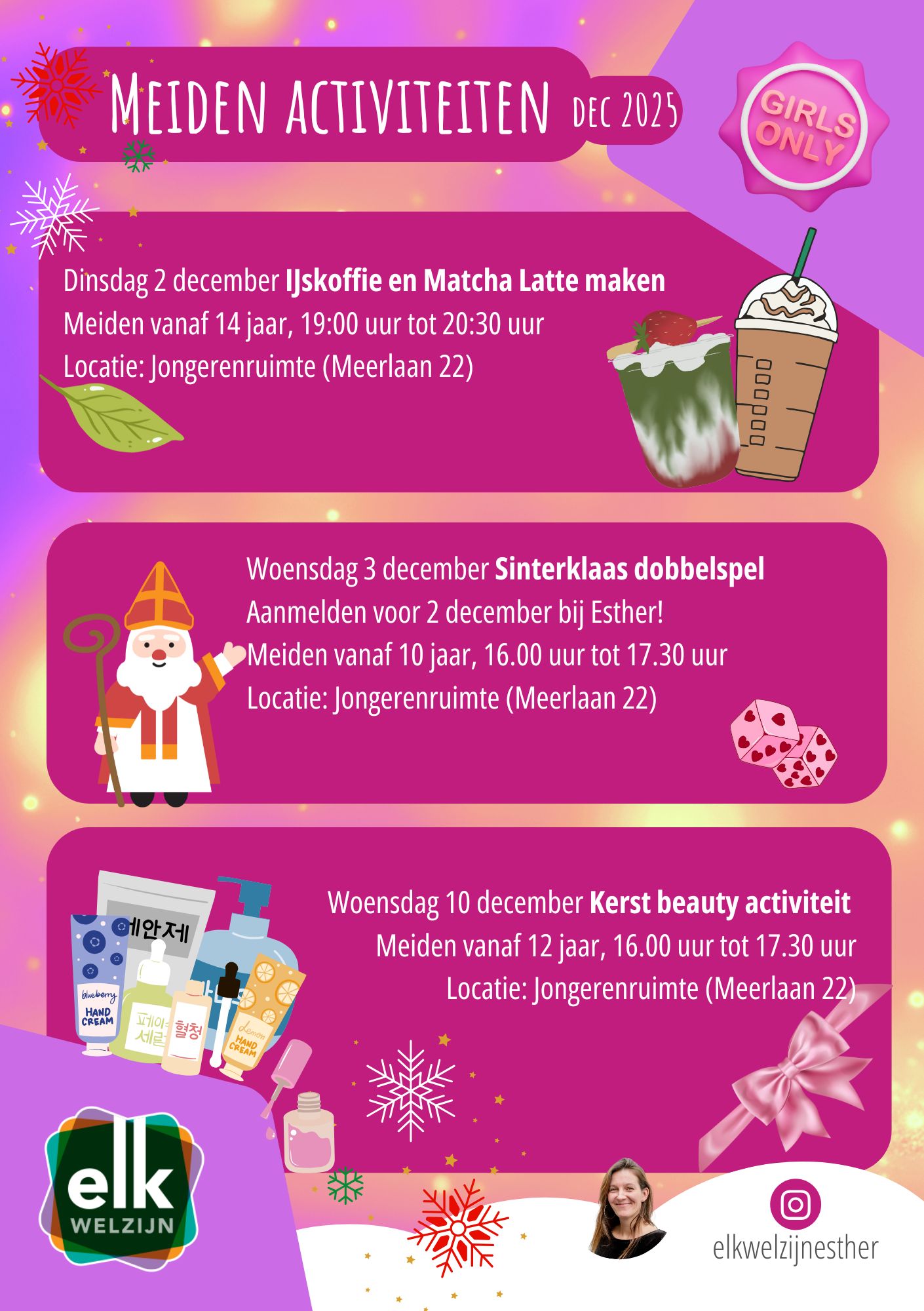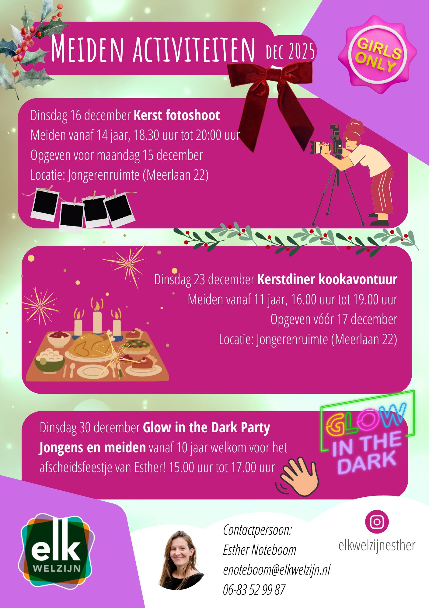 Deze decembermaand hebben we een aantal toffe activiteiten speciaal voor meiden. Van een gezellige kerstfotoshoot en een smakelijk kerstdiner-kookavontuur tot een knallend Glow in the Dark afscheidsfeestje (helaas gaat jongerenwerker Esther ons verlaten): er is voor ieder wat wils!