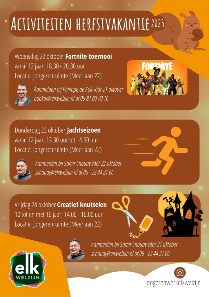 Ook in de herfstvakantie 2025 hoeven kids en jongeren in Culemborg zich niet te vervelen! De kind- en jongerenwerkers van ElkWelzijn organiseren een week vol leuke, creatieve en sportieve activiteiten. Alle activiteiten zijn gratis en toegankelijk voor verschillende leeftijden.