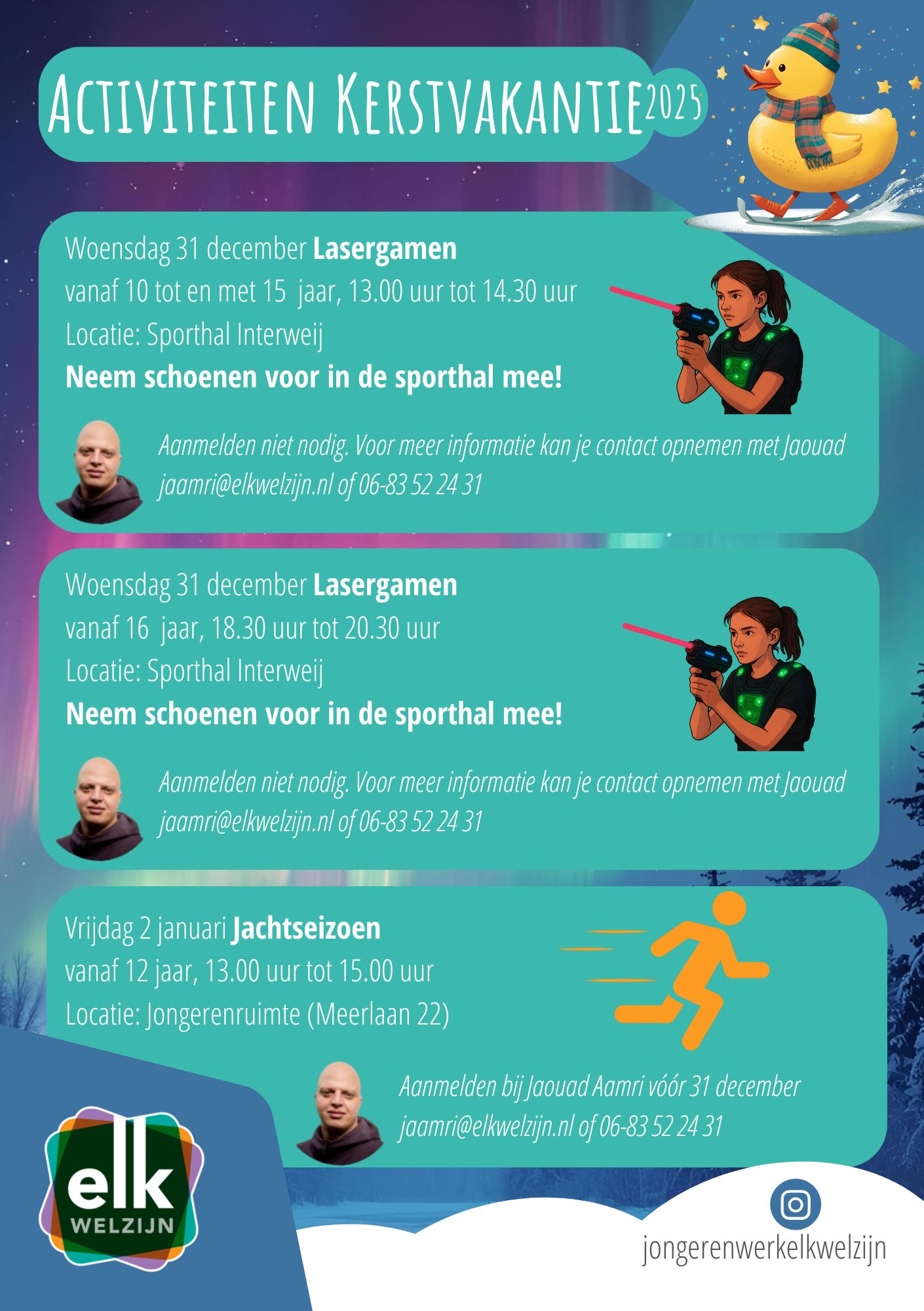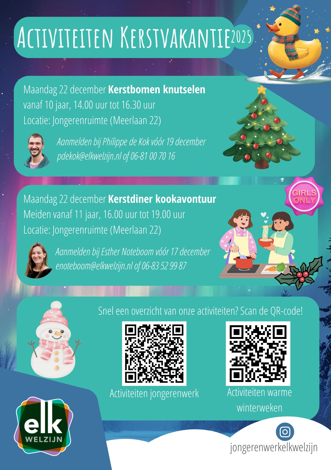 Jongeren in Culemborg hoeven zich niet te vervelen tijdens de kerstvakantie. De jongerenwerkers van ElkWelzijn organiseren allerlei leuke activiteiten. Alles is gratis, dus doe mee!