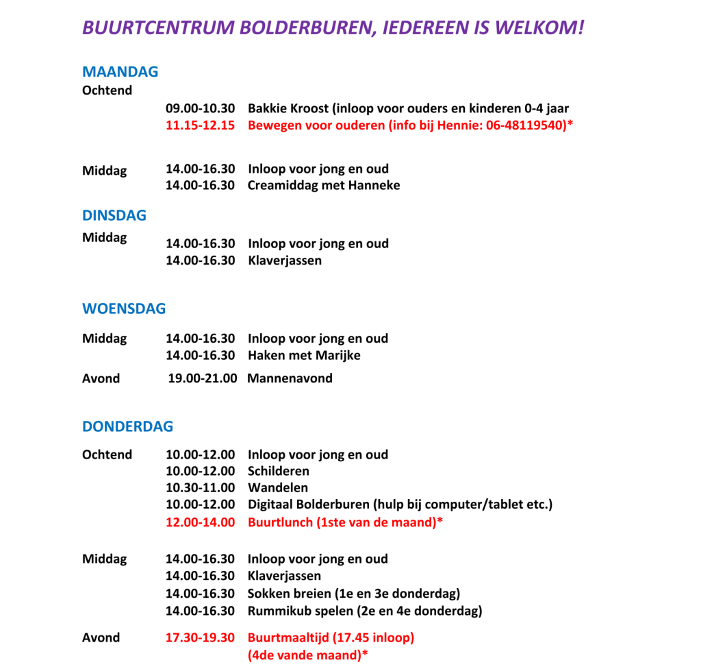 Buurtcentrum Bolderburen is van en voor inwoners van Culemborg. Iedereen is welkom! Voor kinderen is een leuke kinderhoek ingericht en een zwerfboekenkast. Een enthousiaste groep vrijwilligers (buurtbewoners) organiseert hier talloze activiteiten voor jong en oud. Zij zorgen ervoor dat het op verschillende dagen mogelijk is om gezellig samen met anderen een kopje koffie, thee, wat fris, een wijntje of een biertje te drinken. De ontmoeting en de gezelligheid staat voorop. Nieuwe bezoekers worden vriendelijk ontvangen en zijn meer dan welkom!