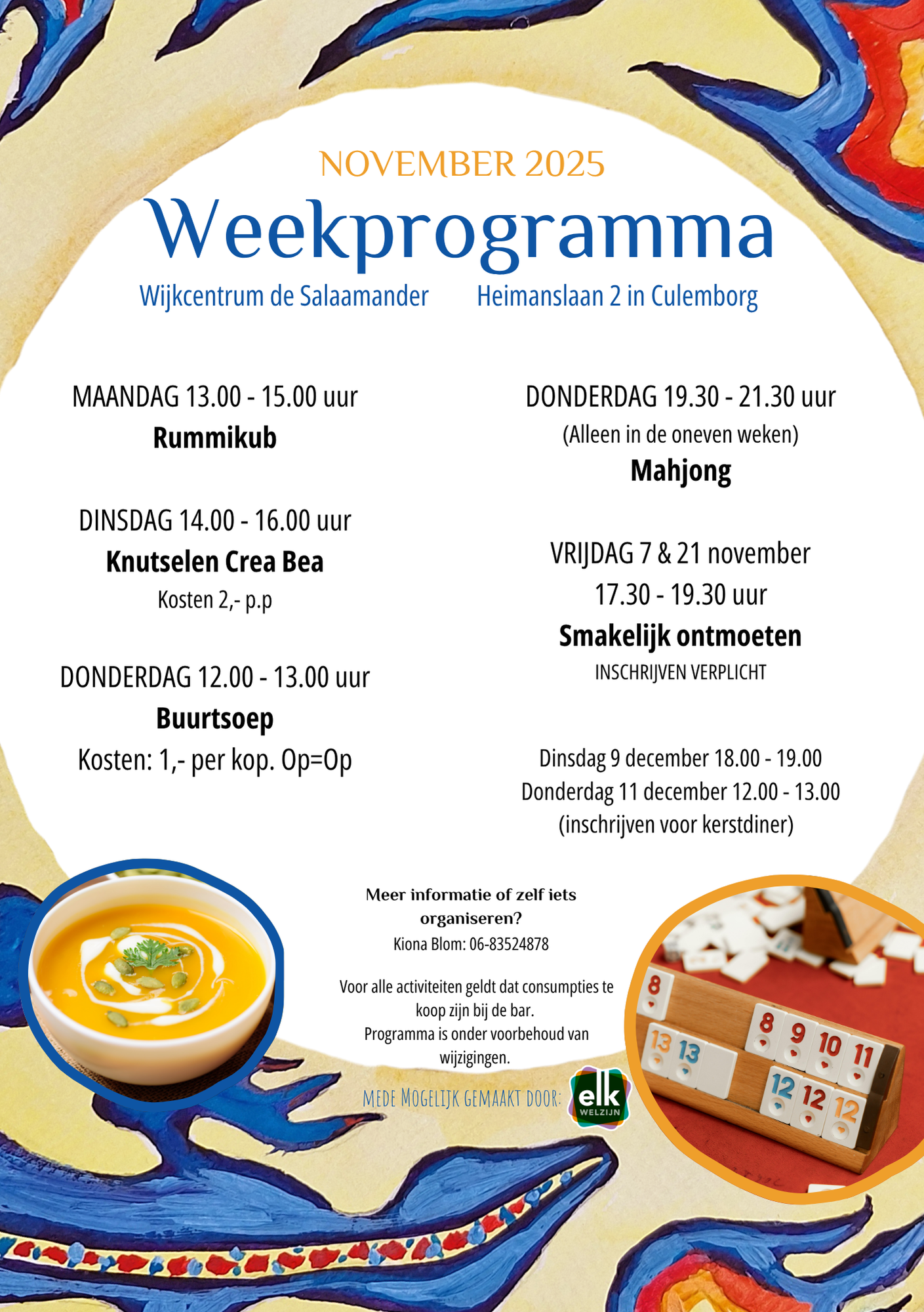 Wijkcentrum de Salaamander is een mooie ontmoetingslocatie in Culemborg Oost. Een plek met veel potentie. ElkWelzijn ondersteunt bewoners bij het opzetten van activiteiten voor de buurt. Inmiddels zijn er al meerdere activiteiten van start gegaan met een groep van ongeveer 20 vrijwilligers. Zo koken zij regelmatig een maaltijd vanuit Smakelijk Ontmoeten, is er een weggeefkast, is de ingang opgevrolijkt met planten en staat er een opvallende mozaïekbank bij de ingang, gemaakt door bewoners en kinderen van de Brede school Oost.